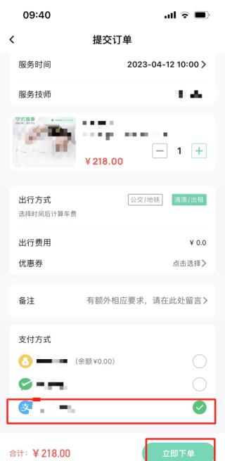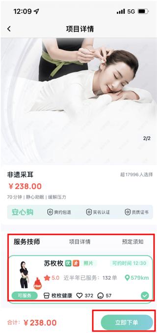 2、在项目详情页面,选择服务技师,然后点击立即下单