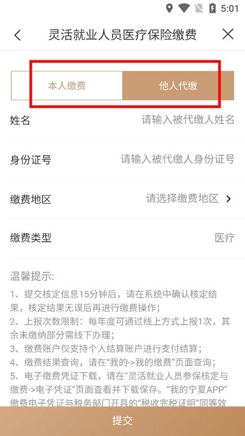 4、根据实际情况,选择本人缴费,与他人缴费,选择完成后,填写姓名、身份证、缴费地区以及缴费类型等,最后点击提交即可完成缴纳。