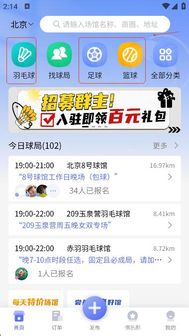 登录后,用户直接点击主页的球类,进入页面挑选球馆