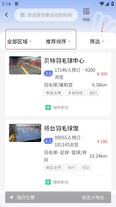 例如,用户挑选羽毛球馆,可以自行提供筛选挑选自己想要预约的球馆