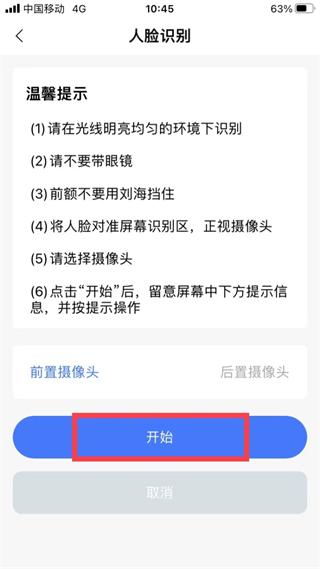 4、根据系统提示,选择“前置摄像头”或“后置摄像头”,点击“开始” 进入人脸识别页面,然后根据系统界面提示完成“人脸识别认证”即可。