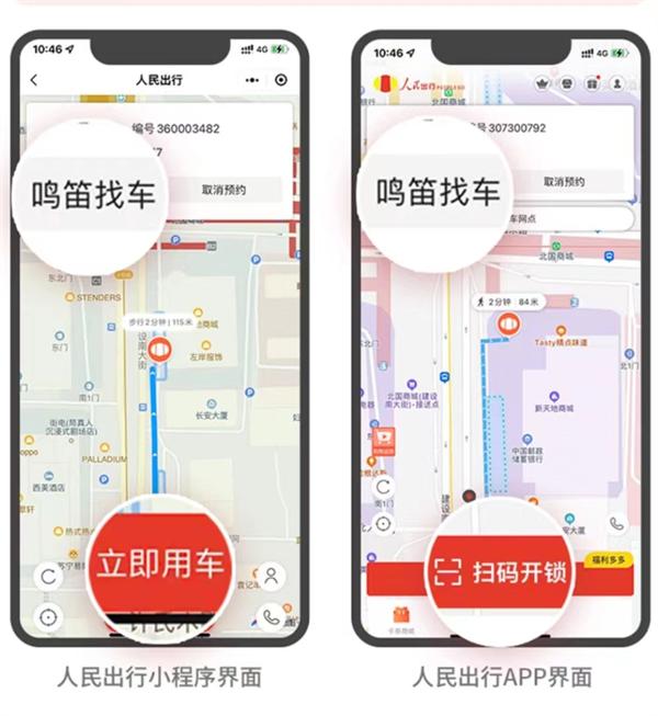 1、便捷租车:用户可以通过手机下载人民出行app,完成实名注册后,即可使用手机扫描车身二维码开锁用车,操作简单方便,随时随地都能租用车辆。