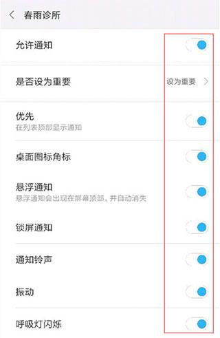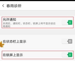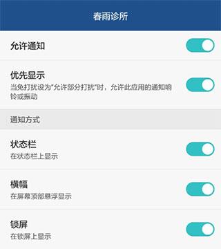设置→状态栏与通知→允许通知的应用→选择【春雨诊所】→以下均选择“打开”。