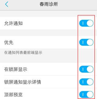 第一步:设置→通知栏和状态栏→通知中心→选择【春雨诊所】→将设置全部选择“打开”。