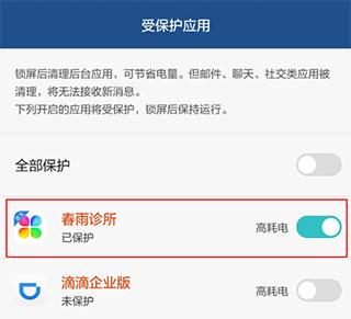 第二步:设置→高级设置→电池管理→受保护应用→选择【春雨诊所】→打开进行保护。