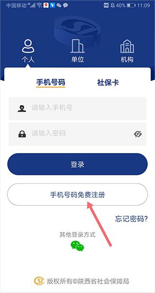 步骤一:打开“陕西养老保险”APP,进入登录页面下点击下方的“手机号免费注册”