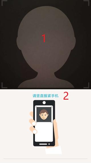 接着按照下图操作顺序,将脸部置于下图“1”位置正中央,然后按照下图“2”位置的文字提示完成实名注册操作