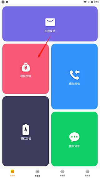 1、在本站下载社恐快跑软件后打开,打开后可以看到有很多功能,点击模拟余额可以恶搞朋友;
