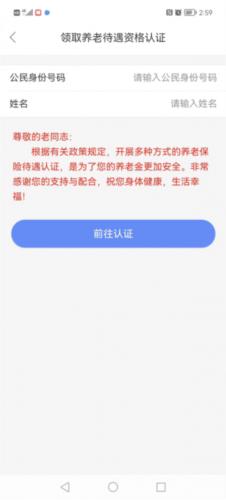 3、点击“养老待遇领取资格认证”后界面如下。输入需要认证人员的身份证号码及姓名(可为其他人员认证),点击“前往认证”