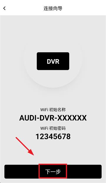 进入连接向导界面后,点击下一步,跳转至wifi连接界面,找到AUDI-DVR-XXXXXX的WiFi,连接密码为12345678,连接后返回奥智行APP即可