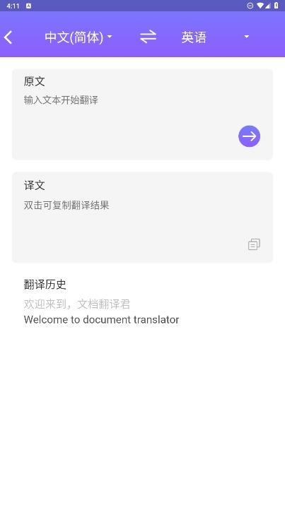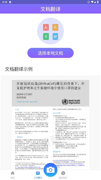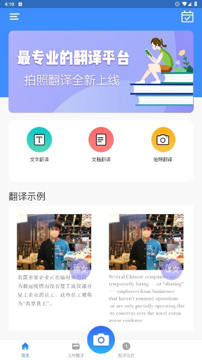 1.进入软件之后可以直接在首页中进行文字翻译、文档翻译、拍照翻译,还可以查看翻译示例。