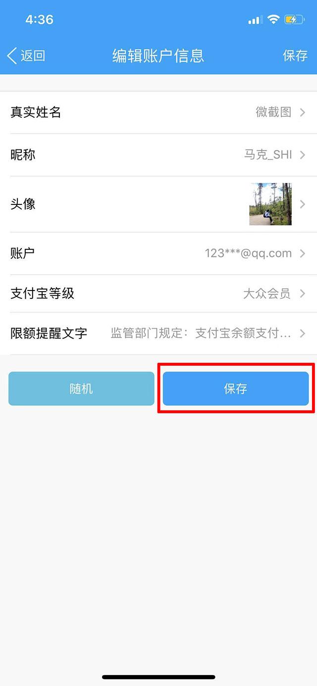 3.编辑用户姓名、昵称、头像、账户等信息,点击保存