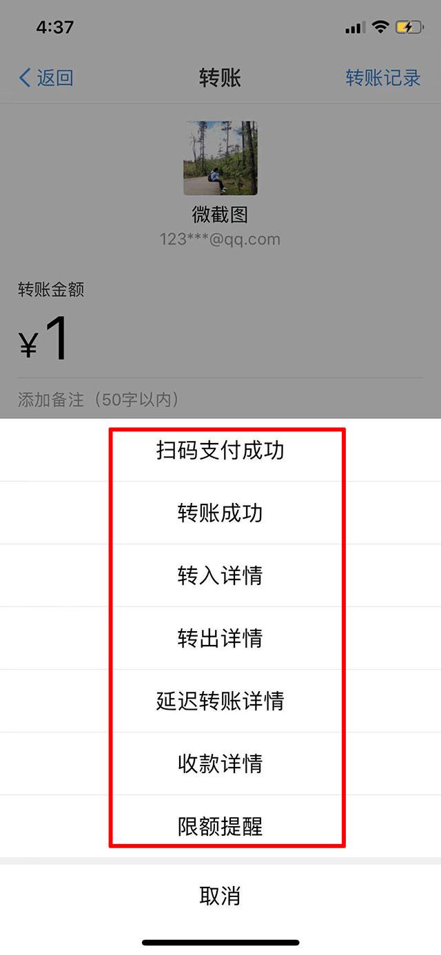 5.然后在出现的菜单中选择你要的页面。支付宝转账页面包括了扫码支付成功页面、转账成功页面、转入转出详情页面、延迟转账详情页面、收款详情页面、限额提醒页面等